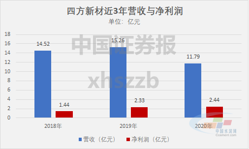 2018-2020年,四方新材分別實現營業(yè)收入14.52億元、15.26億元、11.79億元,凈利潤分別為1.44億元、2.33億元、2.44億元。2021年一季度,公司預計實現營業(yè)收入2.02億-2.42億元,同比增長36.69%-64.02%;預計實現凈利潤3054.04萬-3945.32萬元,同比增長33.50%-72.46%。