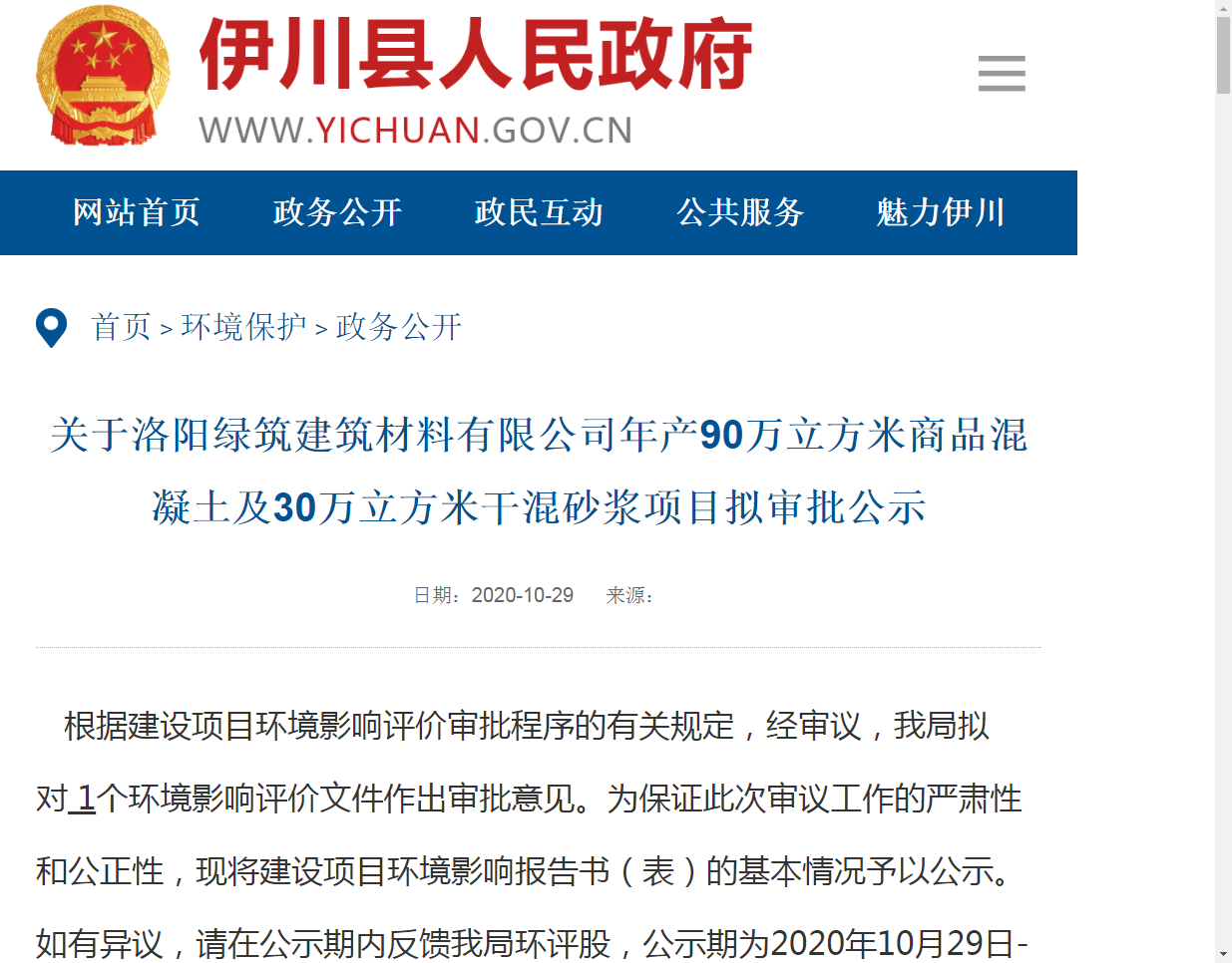 關(guān)于洛陽綠筑建筑材料有限公司年產(chǎn)90萬立方米商品混凝土及30萬立方米干混砂漿項目似審批公示