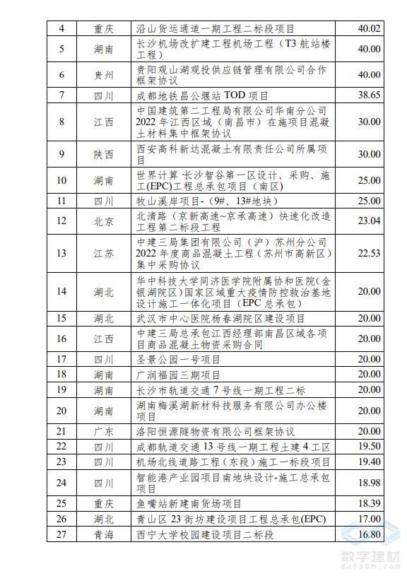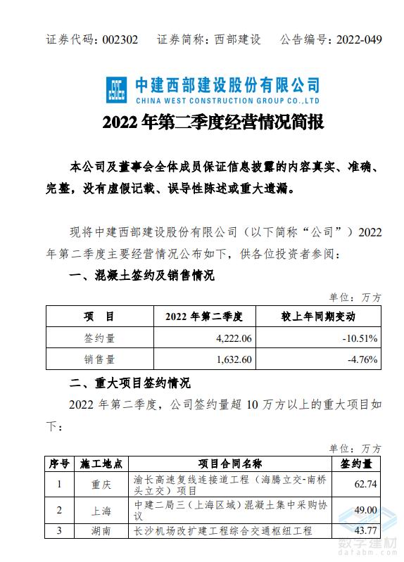 西部建設7月18日午間公告稱,公司2022年第二季度混凝土簽約量為4222.06萬方,較上年同期下降10.51%;混凝土銷售量為1632.60萬方,較上年同期下降4.76%。第二季度簽約量超10萬方以上的重大項目共有81個,合計1356.22萬方。