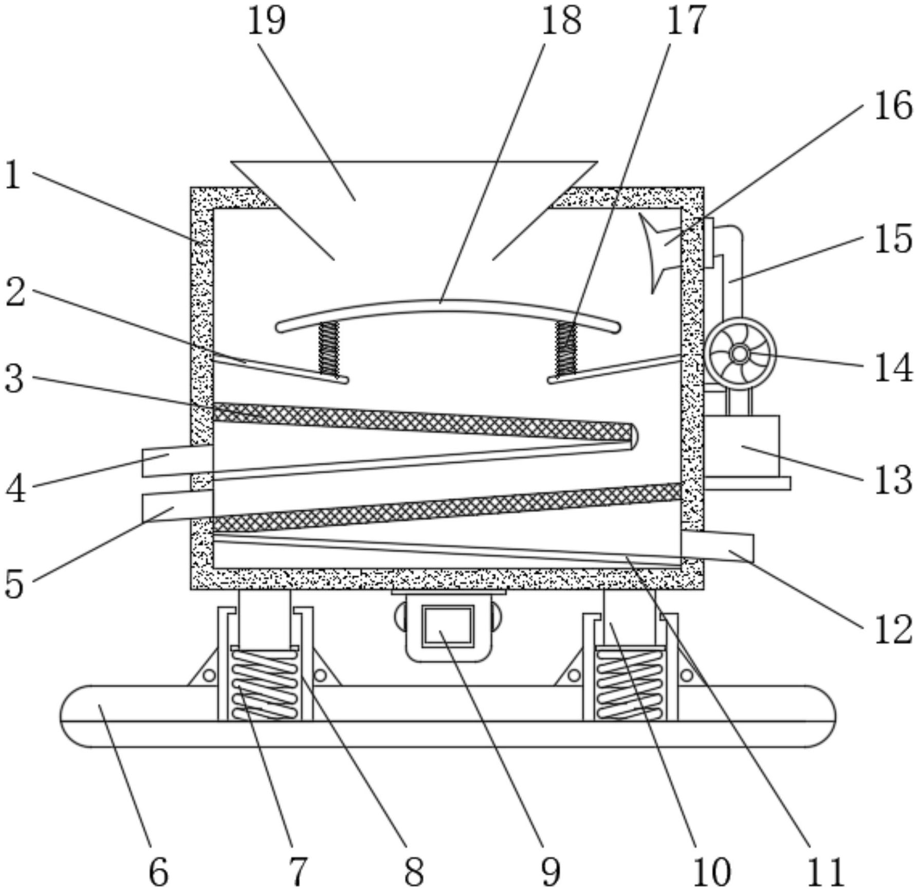 通過企知道查詢專利原文得知,該技術(shù)本實用新型中,砂石在上層篩網(wǎng)進行分離時,物料通過振動電機和篩網(wǎng)自身的斜度,物料在頂端篩網(wǎng)中滾動篩分,沙子從滑料板中滑出,物料運動到頂端篩網(wǎng)一端時,會下落到底端篩網(wǎng)中,繼續(xù)進行砂石分離,通過振動和雙層篩分,有效地將砂石分離開,提高了效率,同時,篩分產(chǎn)生的灰塵通過吸塵機吸入除塵器中,進行除塵,減少大量浮塵,有利于提高人工作環(huán)境。