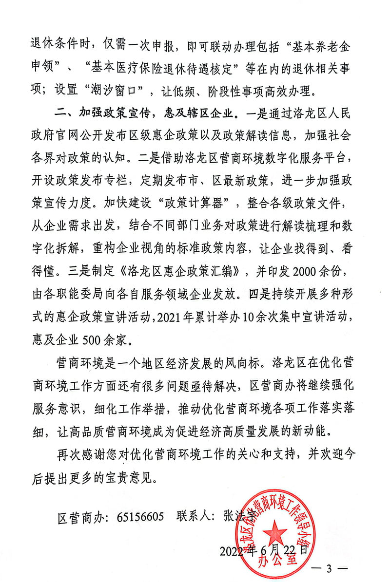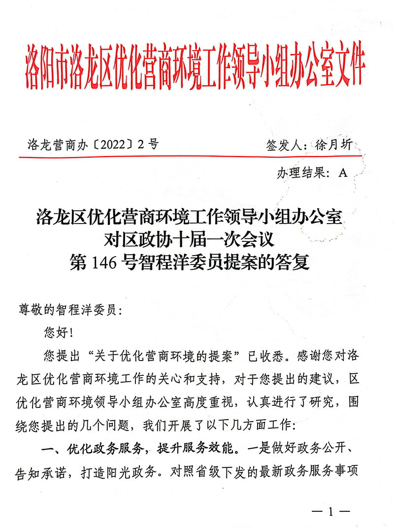 洛龍區(qū)優(yōu)化營商環(huán)境工作領導小組辦公室對區(qū)政協(xié)十屆一次會議第146號智程洋委員提案的答復