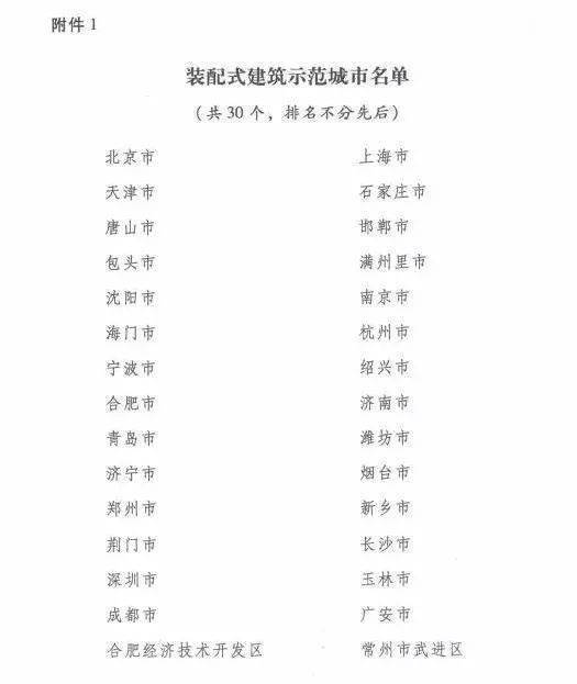 北京、南京、杭州、紹興、鄭州、合肥、成都等30個城市,被認(rèn)定為第 一批裝配式建筑示范城市;